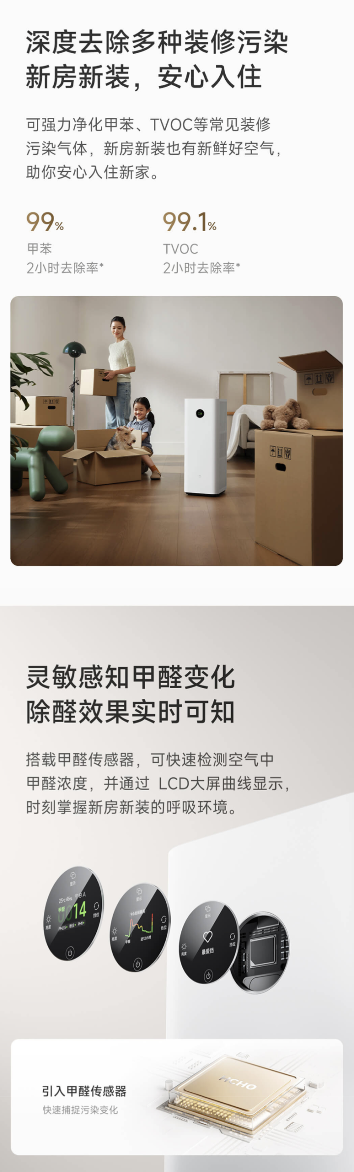 据介绍,该机新升级双芯结构,采用七重复合精华矩阵股腰包,使用塔式单电机双扇叶及阶梯倾斜蜗舌风道设计,配合双净化滤芯结构,扩大进风口面积,提升滤镜使用效率,同时每个滤芯都搭载了多重除醛配方,号称1小时可以去除99%的甲醛。